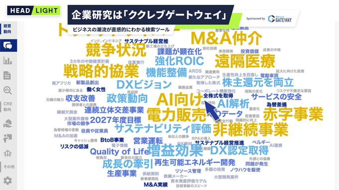 ククレブゲートウェイでは、有価証券報告書や中期経営計画を独自に分析し、企業や業界の戦略を表すキーワードを視覚的に表示する「ホットワード分析」機能を提供しています。